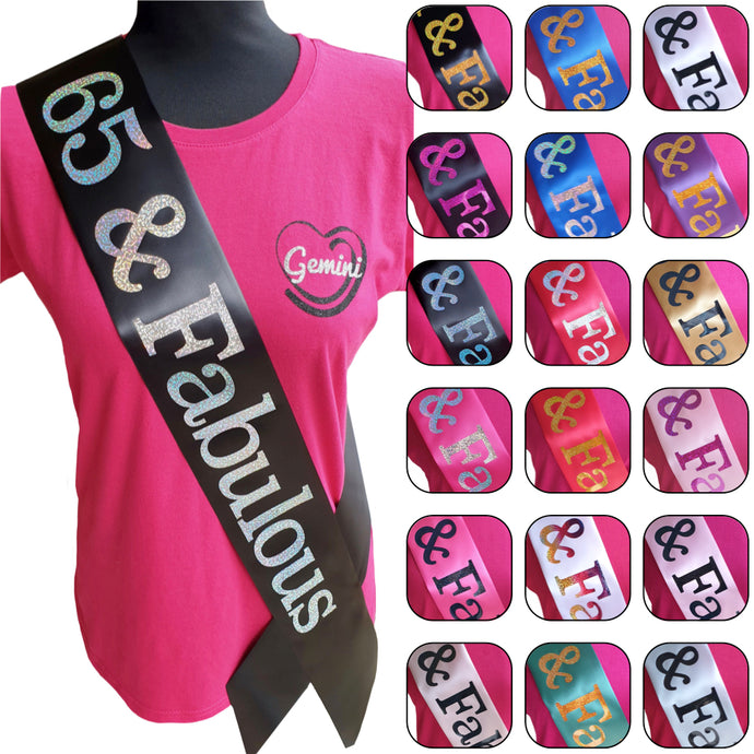 We have a large range of aged sashes for men and women, our unisex sashes come in ages 13, 16, 21, 25, 30, 35, 40, 45, 50, 55, 60, 65, 70, 75, 80, 85, 90, 95, 100. We also have a huge range of colours including black, silver, gold, pink, blue, purple, yellow, green and white.