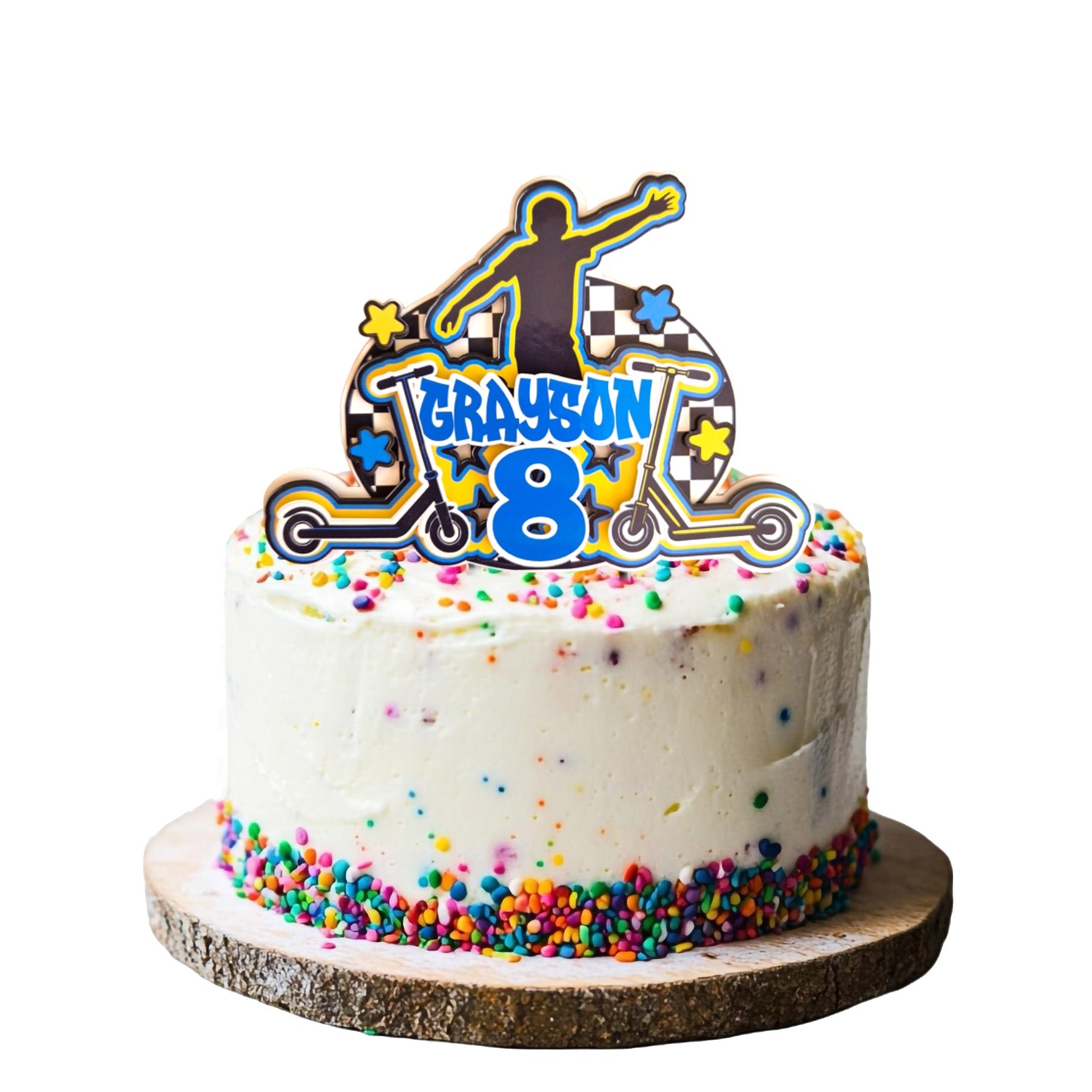The topper is made up of beautiful layered glitter card stock and vinyl. You can choose your name and age. Please note if the name is longer than 3 letters it may go across the scooters.