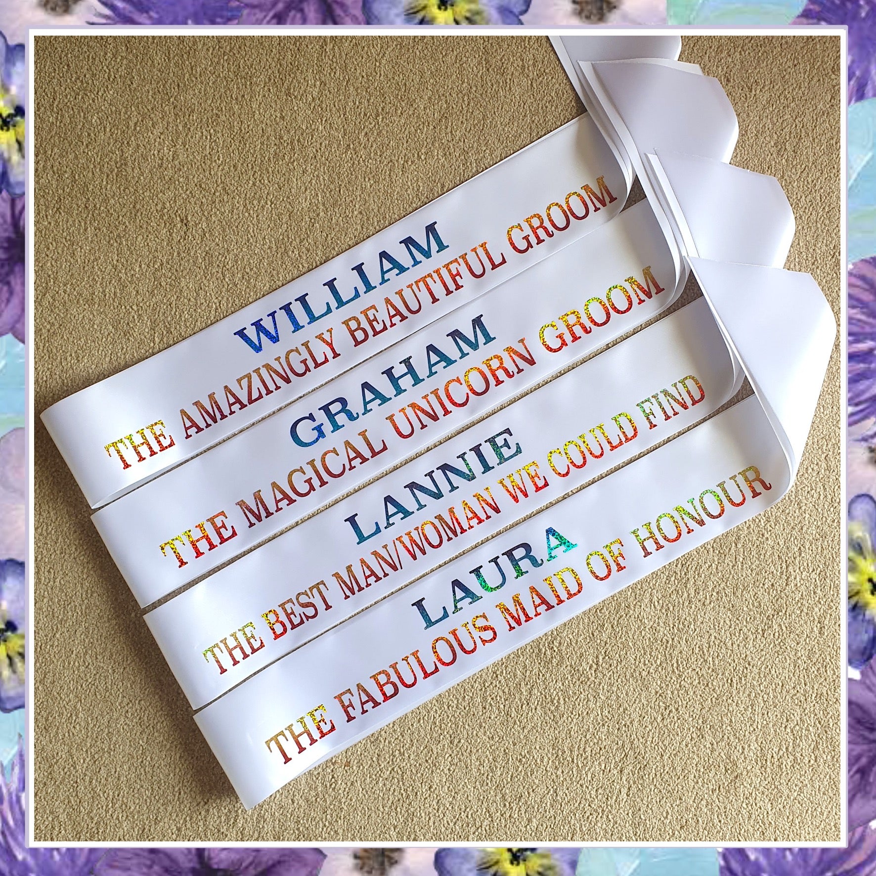 This sash is handmade using high quality satin ribbon with measures 170cm in length and 10cm wide.
